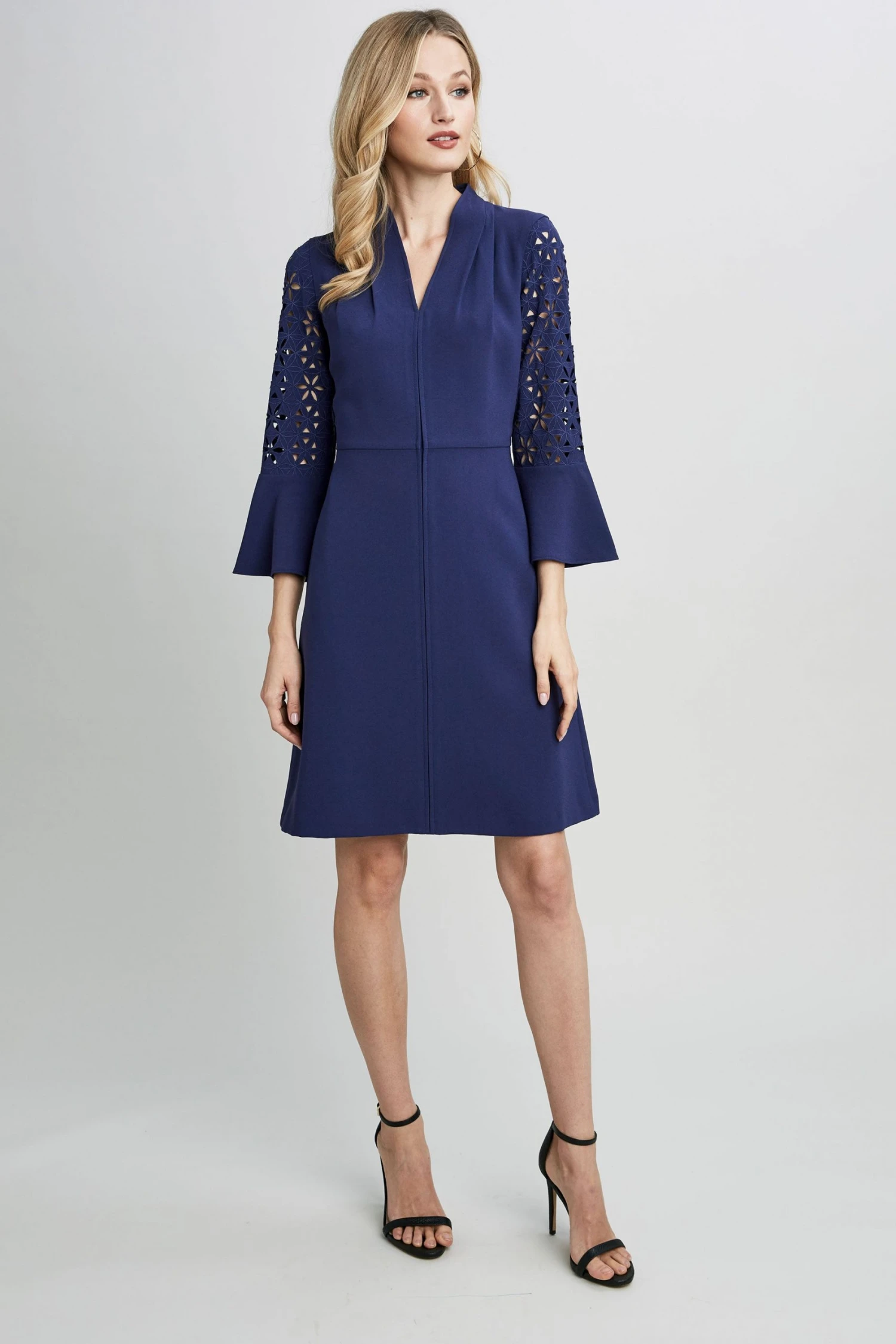 - Fit & Flare Fluid Crepe Dress with cut out embroidered Sleeves