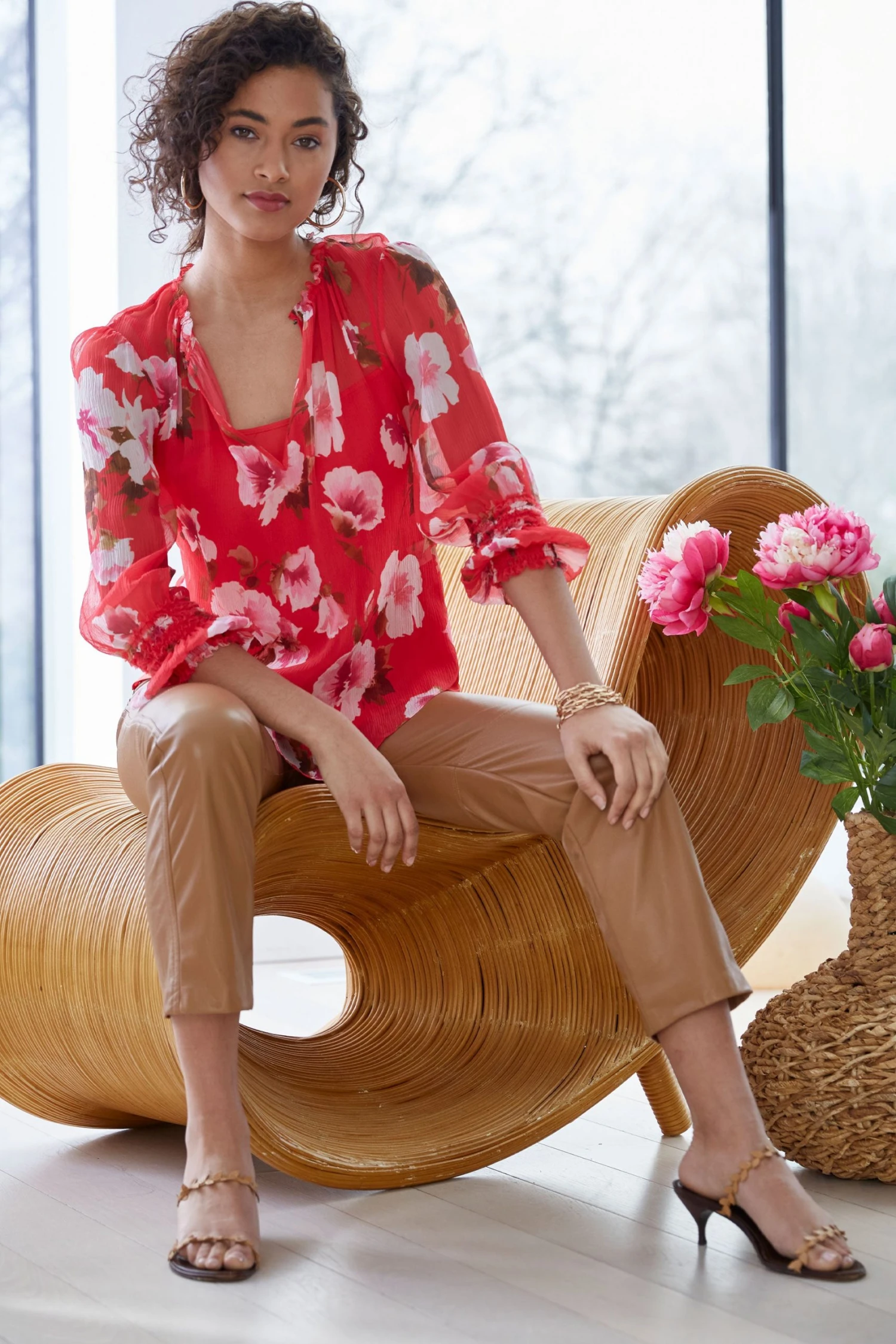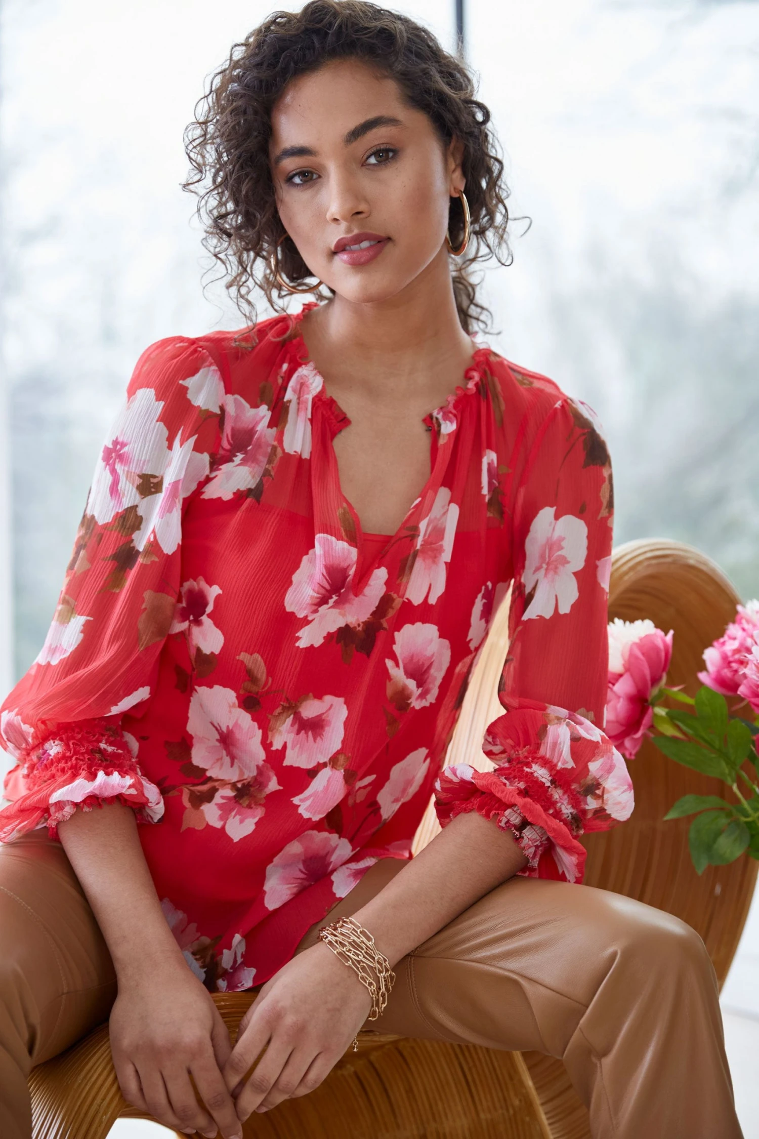 - Silk Crinkle Chiffon Primrose Print Shirt with clasp at the neck