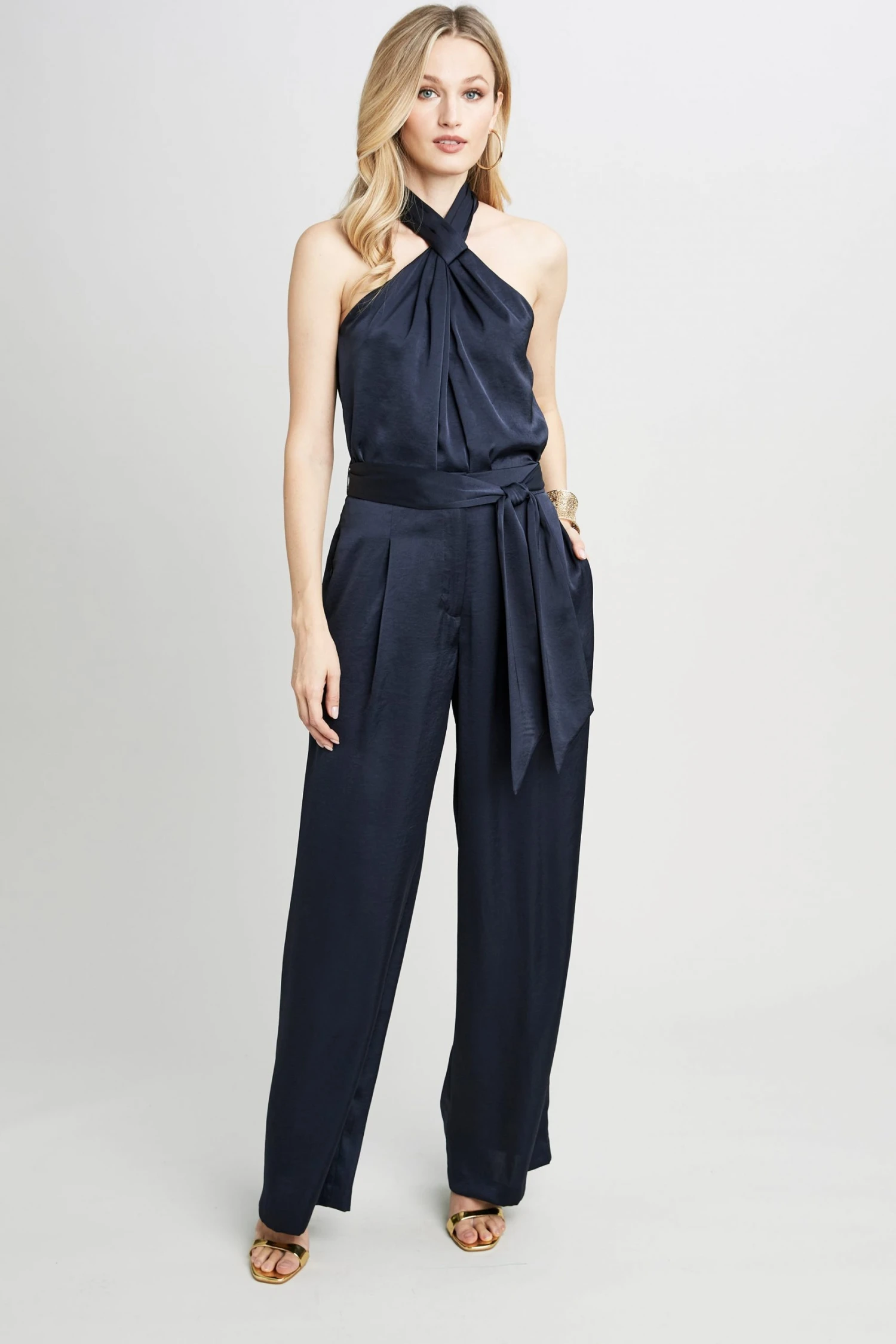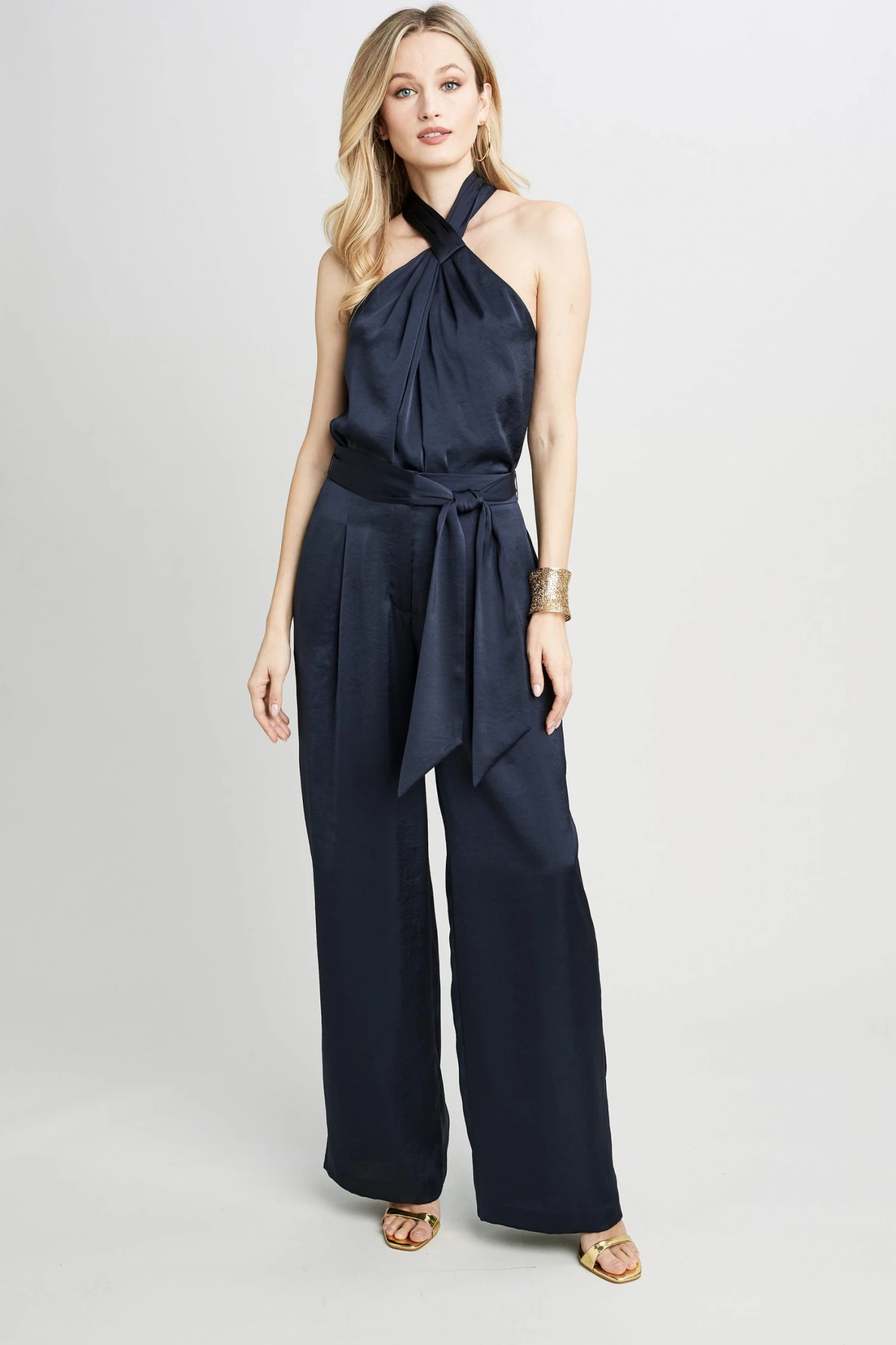 For a fresh take on night dressing, look to our Twist Neck Halter Top. The Luxe Washed Satin piece looks chic paired with its matching wide leg pant for a glam night at home or out.