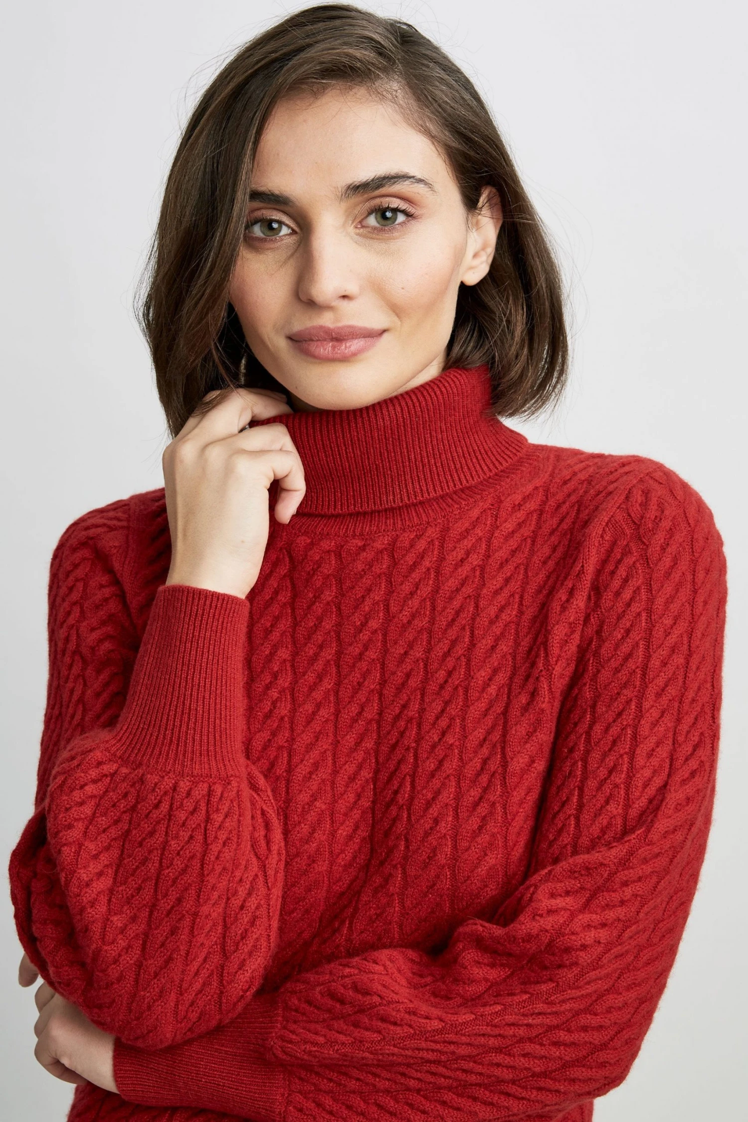 Elevate your turtle-neck wardrobe with our Cable-Knit sweater. Designed in luxurious Cashmere, this sweater features rib trim at the neck, cuffs & hem & blouson sleeves for a feminine feel.