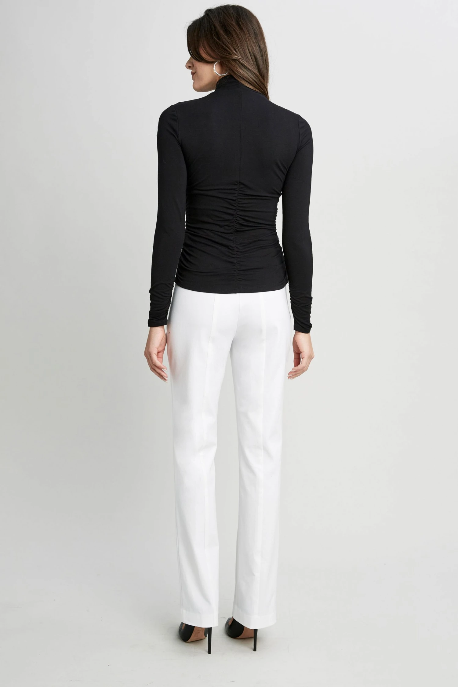 A knit with a wow factor. The modern keyhole neckline and ruched front give artistic expression to our Luxe Viscose Stretch Jersey Tee. Dress it down with Jeans or up with Elie’s Side Slit Crepe Pant