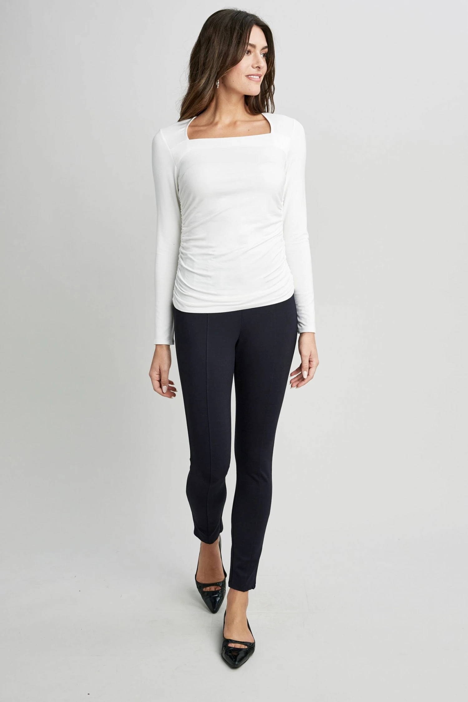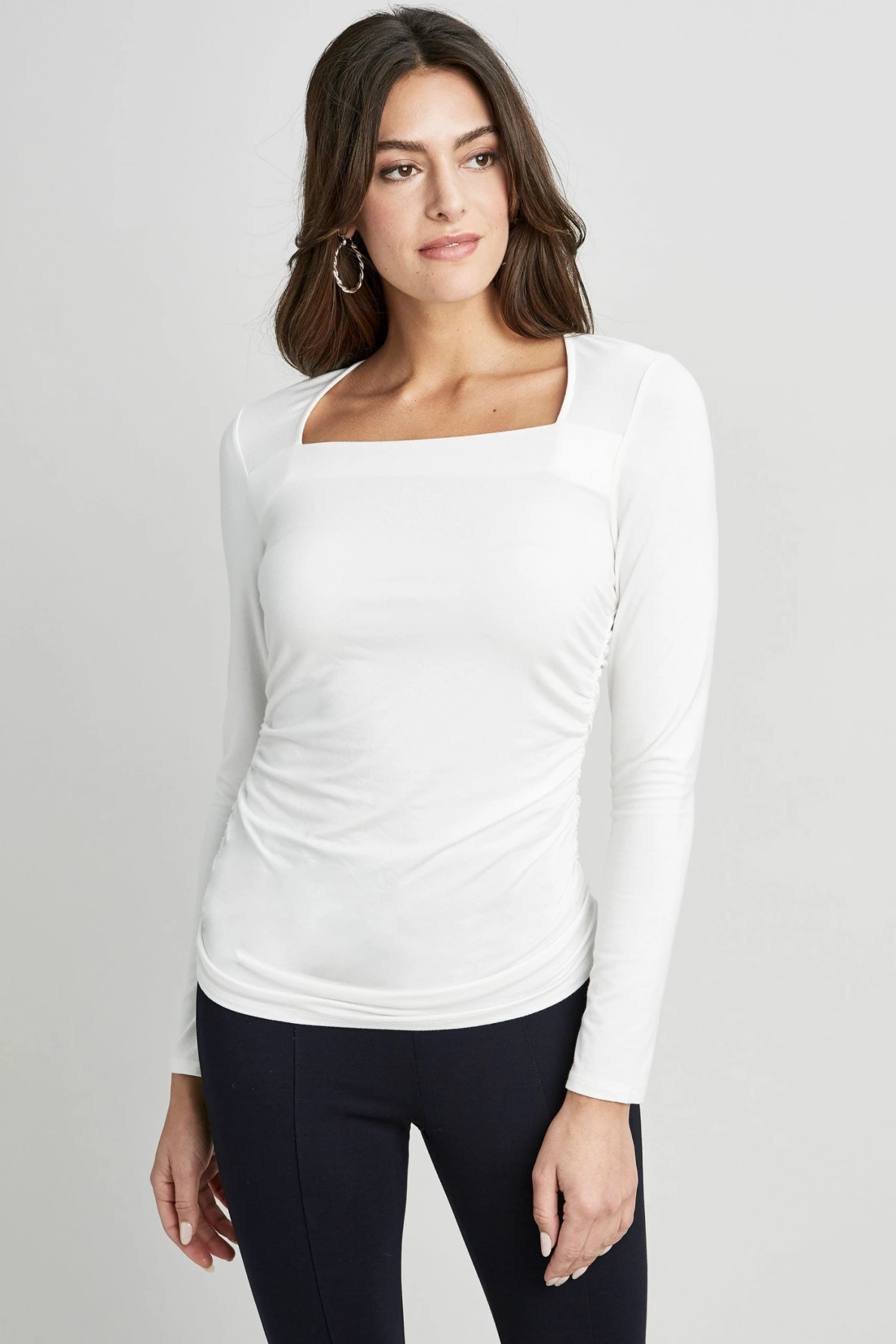 We’re all about this square neckline. Fitted in all the right places – the modern neckline, long sleeves & ruching along the side seams make this the must-have layering piece of the season. The body skimming shape of this Stretch Viscose knit makes it perfect for layering under your favorite blazer or wearing it on its own.
